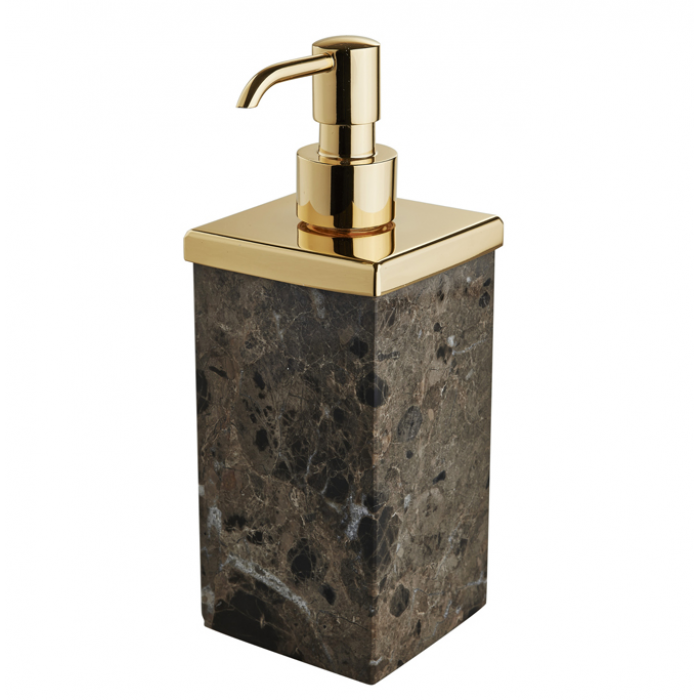 Дозатор для жидкого мыла 3SC Palace PA01DAEMGD Дозатор для жидкого мыла, 3SC, Palace, механический (нажимной), ширина, мм-75, глубина, мм-75, высота, мм-230, тип установки-настольный (свободностоящий), материал колбы-мрамор, цвет колбы-Emperador Dark, цвет дозатора-золото