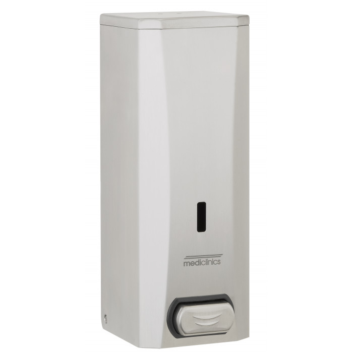 Дозатор мыла Mediclinics DJ0040CS матовый матовый Дозатор жидкого мыла, объем 1,5л, 275х128х110 мм, нержавеющая сталь AISI 304, поверхность матовая 8435265840566 Настенный дозатор с кнопкой для жидкого мыла емкостью 1,5 л - 1 шт, внутренний резервуар -1 шт, клапан - 1шт, ключ -1 шт. Артикул: DJ0040CS Дозатор жидкого мыла емкостью 1,5 л, изготовленный из нержавеющей стали AISI 304 толщиной 0,8 мм, для установки непосредственно на стену и управления вручную с помощью кнопки. Позволяет использовать дезинфицирующие растворы, жидкое мыло или водно-спиртовый гель.