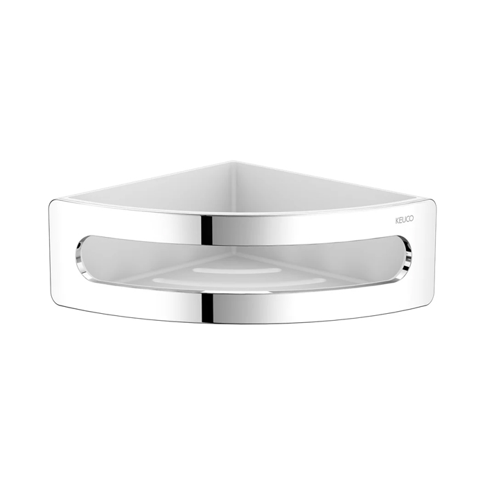 Угловая полочка для душа, съемная вставка Keuco ELEGANCE 11657010000 Хром Keuco ELEGANCE Угловая полочка для душа, съемная вставка (небьющаяся и нечувств. к УФ), скрытый крепеж в к-те цвет: белый/хром латунь крепления (шурупы) 5 лет Германия