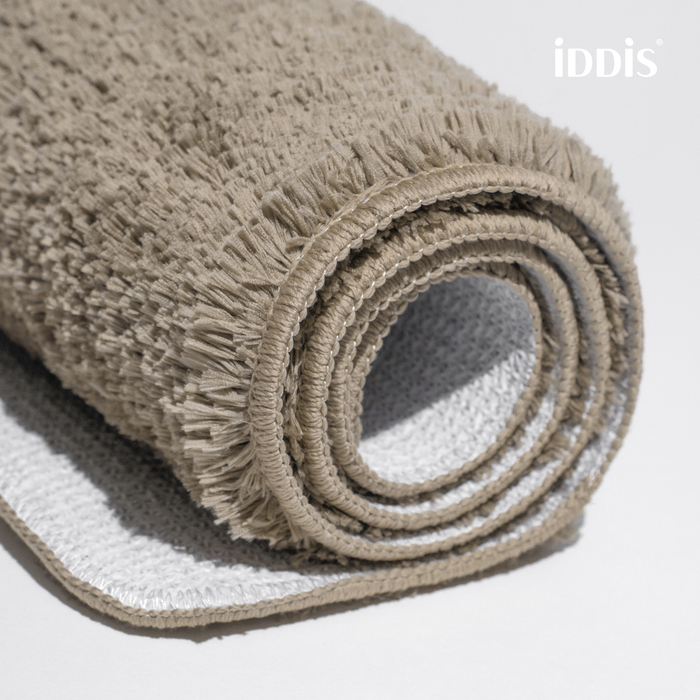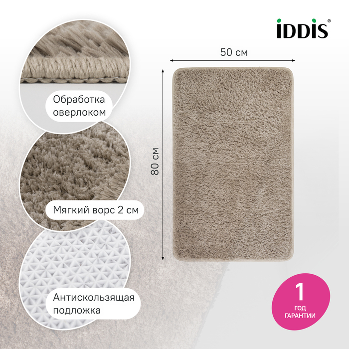 Коврик для ванной комнаты, 50x80, микрофибра, светло-коричневый, IDDIS, BSQS07Mi12 Мягкий коврик для ванной светло-коричневого цвета с плотным высоким ворсом (2 см), очень приятный на ощупь. Стриженый ворс из микрофибры отлично держит форму, легко чистится и быстро сохнет. Коврик подойдет для ванной и туалета.