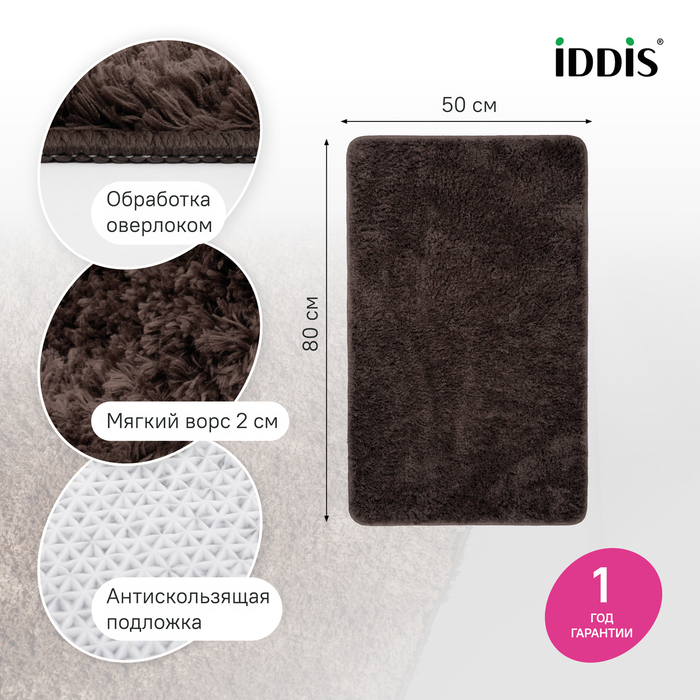 Коврик для ванной комнаты, 50x80, микрофибра, темно-коричневый, IDDIS, BSQS08Mi12 Мягкий коврик для ванной темно-коричневого цвета с плотным высоким ворсом (2 см), очень приятный на ощупь. Стриженый ворс из микрофибры отлично держит форму, легко чистится и быстро сохнет. Коврик подойдет для ванной и туалета.