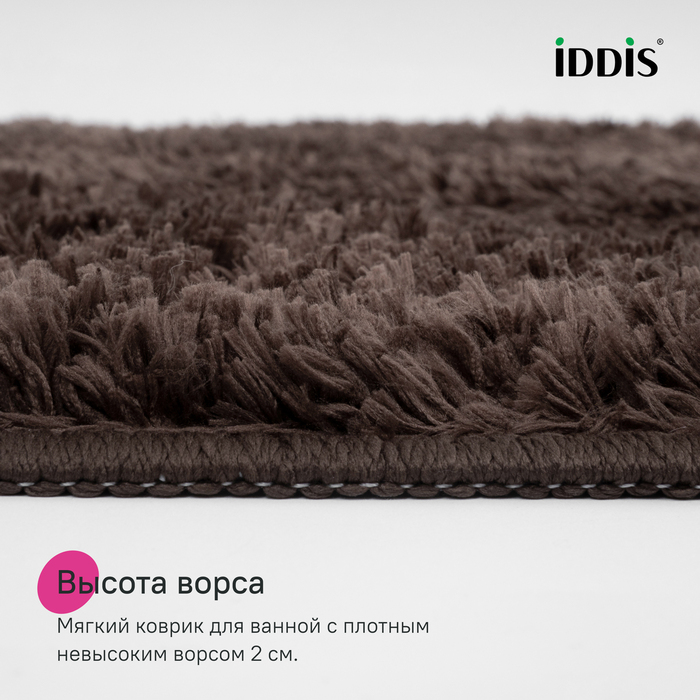 Коврик для ванной комнаты, 70x120, микрофибра, темно-коричневый, IDDIS, BSQL08Mi12IT Мягкий коврик для ванной темно-коричневого цвета с плотным высоким ворсом (2 см), очень приятный на ощупь. Стриженый ворс из микрофибры отлично держит форму, легко чистится и быстро сохнет. Коврик подойдет для ванной и туалета.