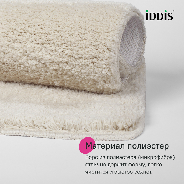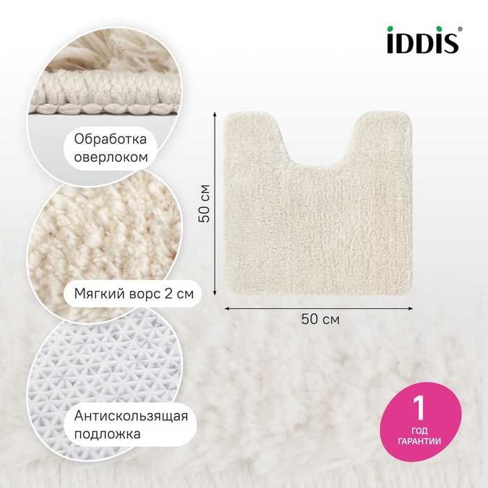Коврик для ванной комнаты с вырезом, 50х50, микрофибра, бежевый, IDDIS, BTLT01Mi12 Мягкий коврик для ванной теплого бежевого цвета с плотным высоким ворсом (2 см), очень приятный на ощупь. Стриженый ворс из микрофибры отлично держит форму, легко чистится и быстро сохнет. Коврик имеет вырез под унитаз и предназначен для туалета.