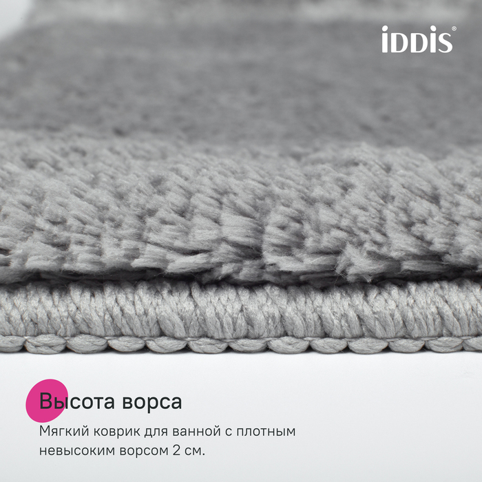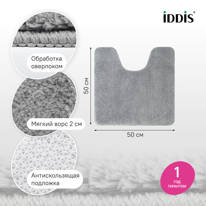 Коврик для ванной комнаты с вырезом, 50х50, микрофибра, серый, IDDIS, BTLT02Mi12 Мягкий коврик для ванной стильного серого цвета с плотным высоким ворсом (2 см), очень приятный на ощупь. Стриженый ворс из микрофибры отлично держит форму, легко чистится и быстро сохнет. Коврик имеет вырез под унитаз и предназначен для туалета.