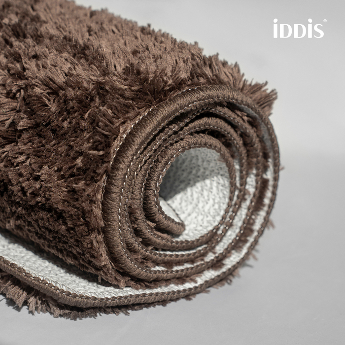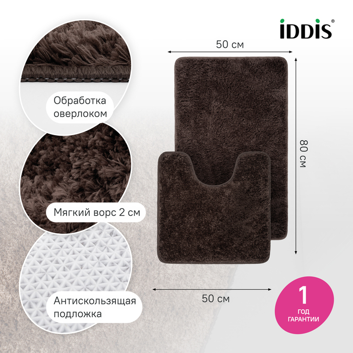 Набор ковриков для ванной комнаты, 50х80 + 50х50, микрофибра, темно--коричневый, IDDIS, BSET08Mi13 Набор из двух мягких ковриков для ванной темно-коричневого цвета с плотным высоким ворсом (2 см), очень приятных на ощупь. Стриженый ворс из микрофибры отлично держит форму, легко чистится и быстро сохнет. Коврики предназначены для ванной и для туалета (маленький коврик имеет вырез под унитаз).