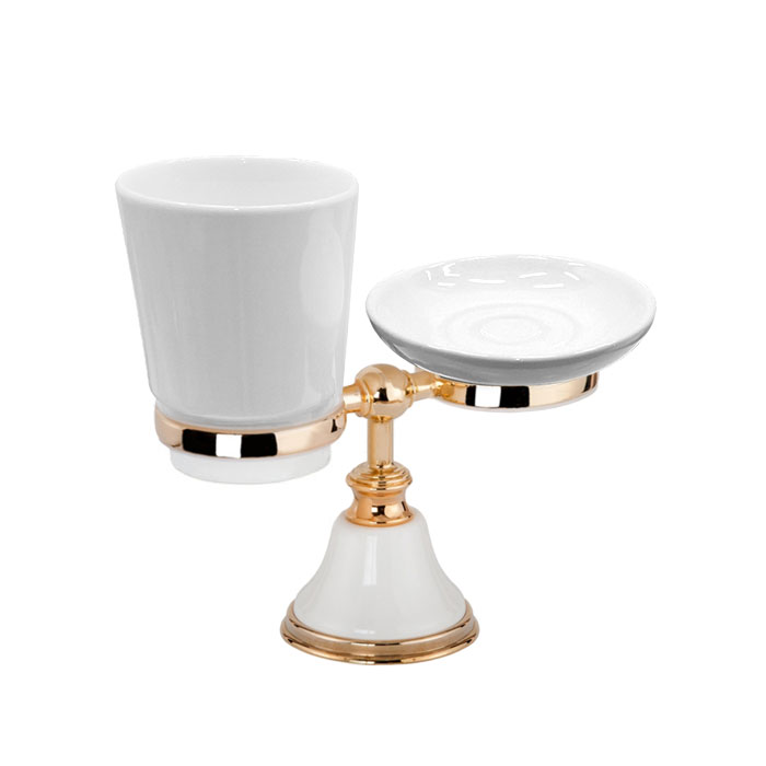 Настольный держатель с мыльницей и стаканом TW collection HARMONY TWHA141bi/oro Золото TW Harmony 141, настольный держатель с мыльницей и стаканом, керамика (бел), цвет: белый/золото