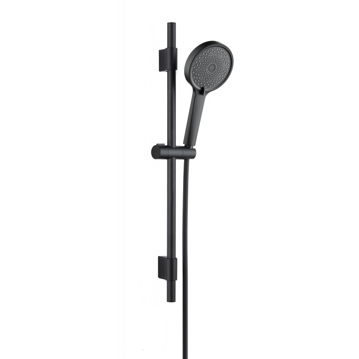 Душевой гарнитур черный SSS712Black ESKO Россия Высота: 710мм Диаметр: 25мм Корпус: нерж. сталь, черный Спец.функции: держатель лейки плавающий FightFix ,подвижное крепление FreeMount Комплектация: Душевой шланг 150см (армированный ,FreeRotation) , Душевая лейка (3 реж., диаметр 120мм), монтажный комплект Цвет: черный