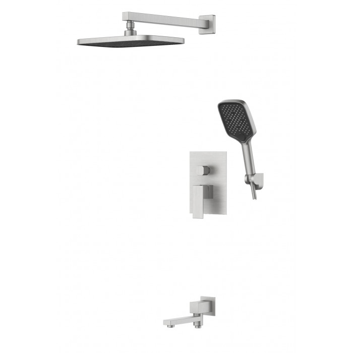 Комплектация (текст): смеситель скрытого монтажа, держатель верхнего душа, верхний душ, излив, держатель ручного душа, ручной душ, шланг для душа, декоротивные накладки, паспорт, монтажный комплект.