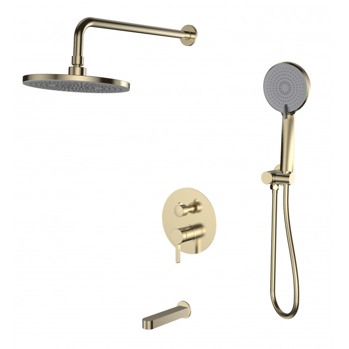 Душевая система скрытого монтажа со смесителем Sochi Gold 7in1SCGold ESKO Россия Картридж Смеситель скрытого монтажа с переключателем: корпус - латунь кат. A, картридж ESKO - 35 мм,переключатель помповый с фиксатором. Лейка верхнего душа: диаметр 226 мм,материал - ABS пластик/золото. Держатель верхнего душа с отводом: длина 376 мм, нерж.сталь/золото. Ручная лейка: диаметр 110 мм, 5 режимов. Душевой шланг 1,6 м: армированный ПВХ, FreeRotation. Излив: латунь, длина 20 см, дивертор с фиксатором. Тип системы: встраиваемая.