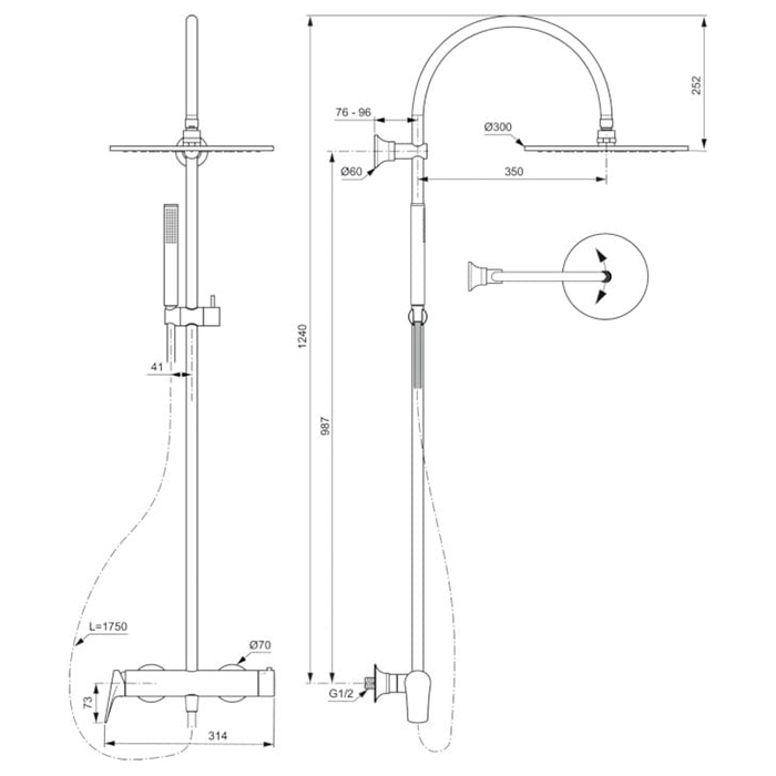 Душевая система Ideal Standard La Dolce Vita BD674AA Хром Ideal Standard La Dolce Vita Душевая стойка, смеситель для душа, верхний душ 30см, руч.душ Stick, шланг Idealflex 175см, цвет: хром