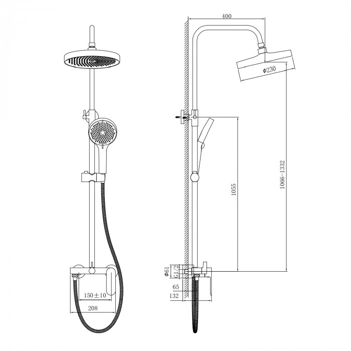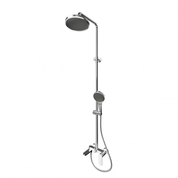 Полная комплектация: система готова к установке сразу из коробки. В наборе: стойка высотой 1332 мм, верхний душ, ручная лейка, гладкий шланг длиной 150 см, эксцентрики и весь необходимый крепёж.