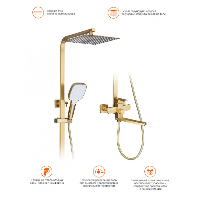 Душевая система Prohanss P30.24.03, сатин золотой ПВХ Душевая система с тропическим душем, смесителем, длинным поворотным изливом и ручной лейкой Prohanss P30.24.03, выполненная в угловатом дизайне - идеальное решение для вашей ванной комнаты. Изготовленная из прочной нержавеющей стали, она гарантирует долговечность и надежность использования.