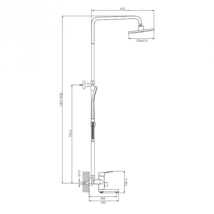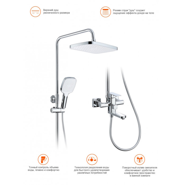 Верхний душ 320х210 мм регулируется по высоте благодаря телескопической штанге и по наклону с помощью встроенного шарнира, что обеспечивает максимальный комфорт и удобство использования. Самоочищающиеся силиконовые форсунки предотвращают образование известкового налета и сохраняют чистоту и силу потока воды.