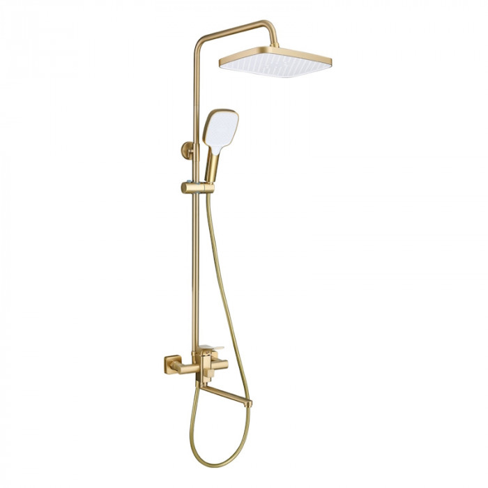 Душевая система Prohanss P62.24.03, сатин золотой ПВХ Душевая система с тропическим душем, смесителем, поворотным изливом и ручной лейкой Prohanss P62.24.03 - идеальное решение для вашей ванной комнаты. Изготовленная из высококачественных материалов, она гарантирует долговечность и надежность использования.