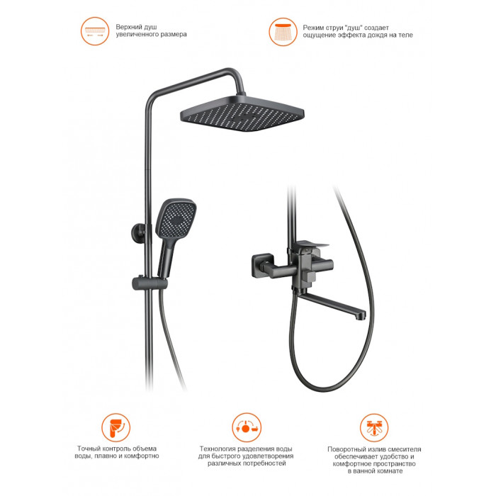 Душевая система Prohanss P62.24.09, графит ПВХ Душевая система с тропическим душем, смесителем, поворотным изливом и ручной лейкой Prohanss P62.24.09 - идеальное решение для вашей ванной комнаты. Изготовленная из высококачественных материалов, она гарантирует долговечность и надежность использования.