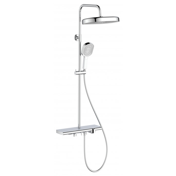 Душевая система со смесителем ST350 ESKO Россия Нерж. сталь Прогрессивный картридж 14 л/мин Телескопическая стойка (нерж. сталь, хром): высота 1500мм , диаметр 24мм , держатель лейки плавающий Fight Fix , подвижные крепления Free Mount Лейка верхнего душа(ABS-пластик, хром) : на подвижном шарнире, 360мм, Ручная лейка: диаметр 114мм, дивертор: Комплектация: армированный душевой шланг 150см, монтажный комплект, подвижный аэратор. Корпус полки - ABS-пластик, трубки PPA Тип системы: Душевая система со смесителем
