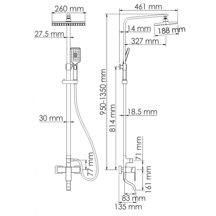 Стойку для душа можно регулировать по высоте. Для этого необходимо выдвинуть верхнюю часть стойки и зафиксировать на необходимой Вам высоте при помощи накидной гайки верхнего крепления.