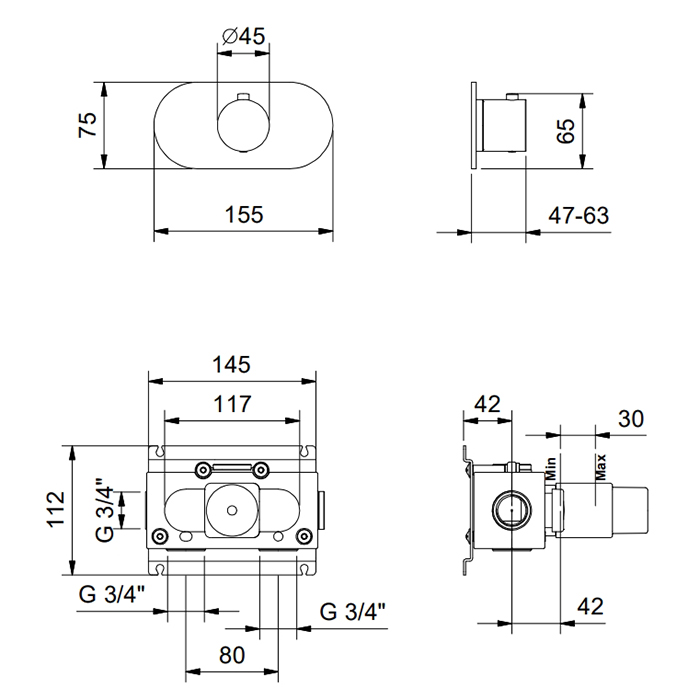 Верхний душ Fantini Fontane Bianche 47 P5 P300B Gun metal FANTINI FONTANE BIANCHE Смеситель настенный встраиваемый, термостатический, цвет Matt Gun Metal PVD