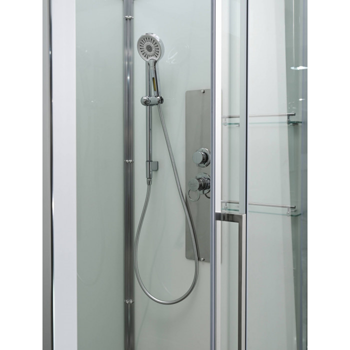 Стильная душевая кабина AvaCan сочетает в себе высокую функциональность, практичность и надежность. При изготовлении применяется безопасное закаленное стекло, надежно фиксируемое алюминиевым профилем. Профиль сделан из алюминия повышенной прочности. Сборка без силикона (увеличивает срок службы, защищает от протечек), внутренняя сборка (облегчает установку и ревизию; позволяет установить в ограниченном пространстве и обойтись без демонтажа других сантехнических приборов), смеситель резьбовой (без хомутов).Двойные металлические ролики дверей (распределение нагрузки на два ролика, увеличивают срок службы). Душевая штанга(позволяет регулировать по высоте ручную лейку), ручная арома-лейка с витамином С (картридж в комплекте,есть возможность замены или удаления картриджа), полочки(из стекла, с ограничителем), сифон с гидрозатвором.