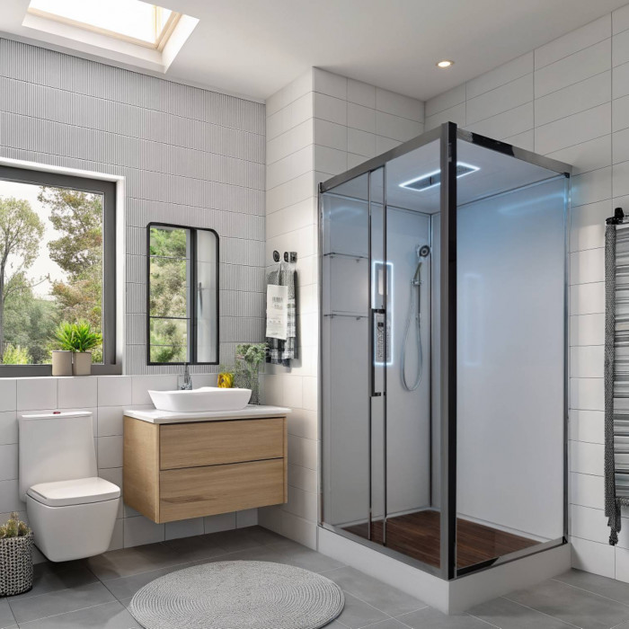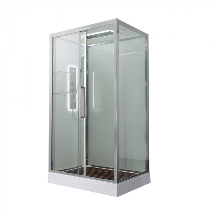 Стильная душевая кабина AvaCan сочетает в себе высокую функциональность, практичность и надежность. При изготовлении применяется безопасное закаленное стекло, надежно фиксируемое алюминиевым профилем.Профиль сделан из алюминия повышенной прочности. Сборка без силикона (увеличивает срок службы, защищает от протечек), внутренняя сборка (облегчает установку и ревизию; позволяет установить в ограниченном пространстве и обойтись без демонтажа других сантехнических приборов), смеситель резьбовой (без хомутов). Двойные металлические ролики дверей (распределение нагрузки на два ролика, увеличивают срок службы). Душевая штанга(позволяет регулировать по высоте ручную лейку), ручная арома-лейка с витамином С (картридж в комплекте,есть возможность замены или удаления картриджа), полочки(из стекла, с ограничителем), сифон с гидрозатвором, сенсорный пульт управления с функциями: блютуз, LED подсветка, радио, вытяжка, гидромассаж спины, тропический (верхний) душ.