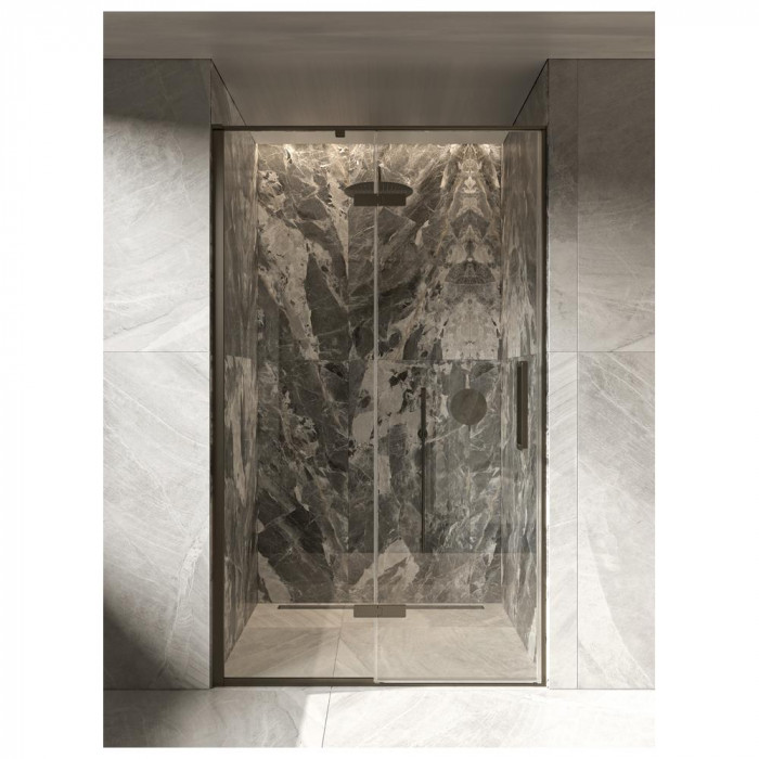 Широкая дверь 120 см для ниш с профилем цвета вороненой стали и стеклом 8 мм. Отличное решение для стильной современной ванной. Покрытие Smart Clean — удобная чистка. Прочный матовый алюминиевый профиль. Полный комплект для монтажа.