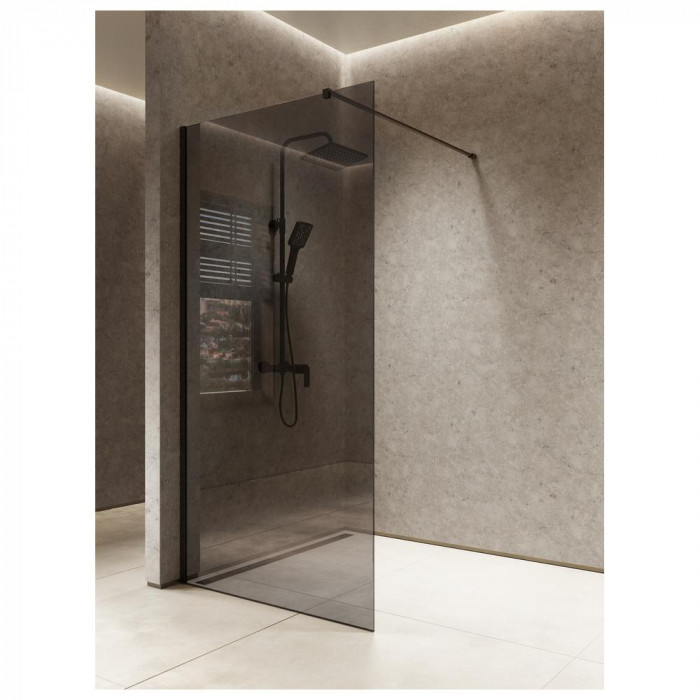 Стильное и функциональное решение для ванной комнаты. Душевое ограждение Walk-In с матовой рамкой черного цвета и тонированным стеклом создаёт атмосферу приватности и уюта. Smart Clean облегчает уход за стеклом. Прочный алюминиевый профиль обеспечивает надежность и долговечность.