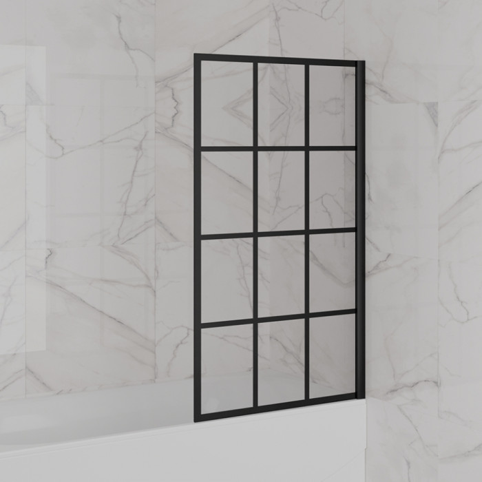 Душевая шторка на ванну Screen 80 см, неподвижная, принт решетка, профиль черный Paini-ScreenWT80G