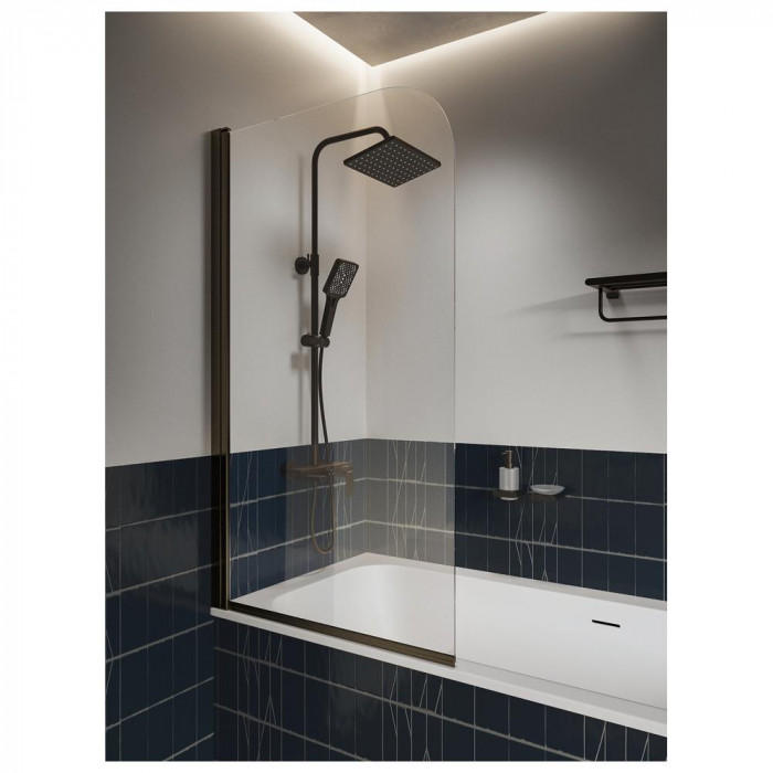 Стильная шторка для ванной с прозрачным стеклом и матовым черным профилем. Модель создаёт современный интерьер, обеспечивая долговечность и лёгкий уход благодаря гидрофобному покрытию Smart Clean.