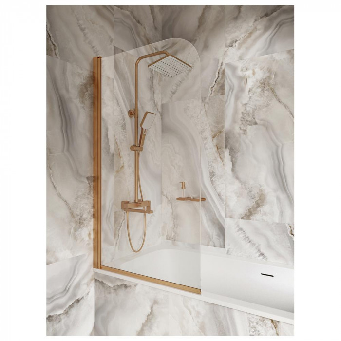 Шторка с прозрачным стеклом и бронзовым матовым профилем, создающая уютный и современный интерьер. Гидрофобное покрытие Smart Clean обеспечивает простоту ухода, а алюминиевый профиль — надёжность и долговечность.