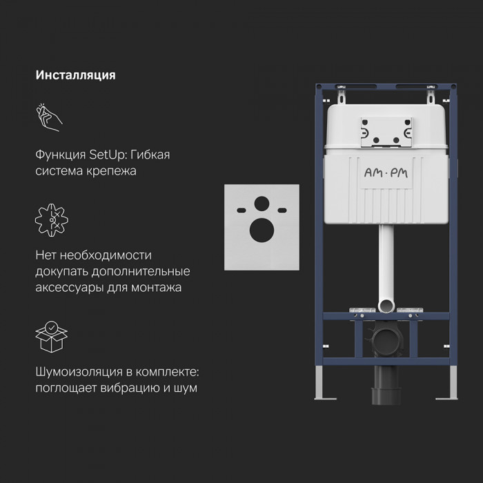 Функция SetUp : Гибкая система крепежа – универсальность и эффективность установочного процесса. Гибко обходит вертикальные и горизонтальные трубы. Высокая прочность и износостойкость. Выдерживает нагрузку до 400 кг. Подходит для унитазов любых размеров. Армированный шланг подачи воды двойная прокладка слива и подачи воды. В комплекте механическая двухрежимная клавиша из ABS пластика в цвете глянцевый хром. Подключение воды сзади сверху.