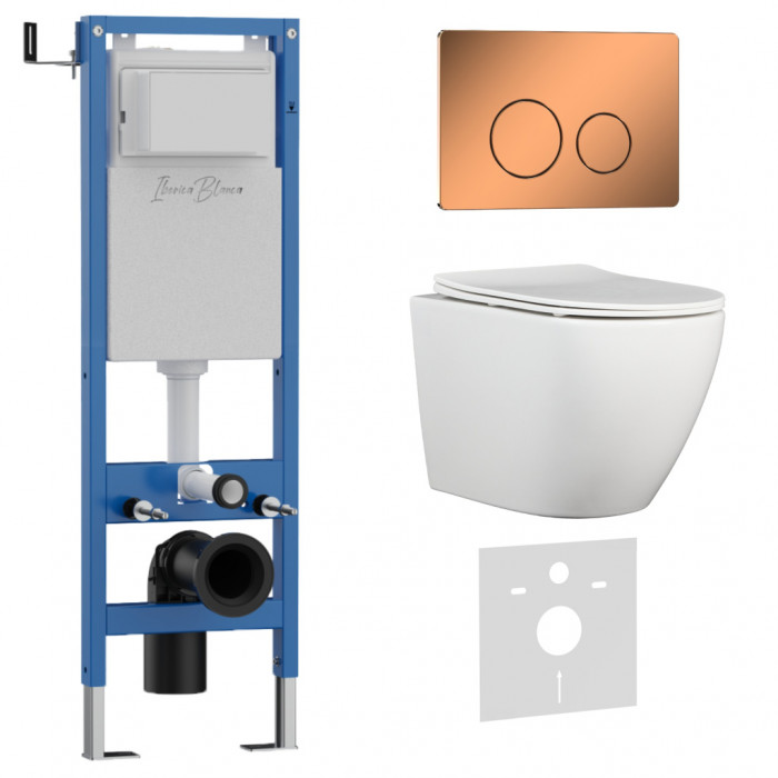 Комплект 3в1 IBERICA BLANCA инсталляция SILENCIO MINI, унитаз BILBAO ALTO белый, кнопка смыва INOX-О розовое золото глянцевое (IB.001M.BLA.234.8171)