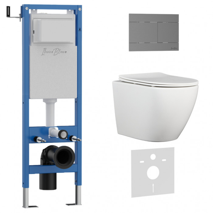 Комплект 3в1 IBERICA BLANCA инсталляция SILENCIO MINI, унитаз BILBAO ALTO белый, кнопка смыва INOX-R вороненая сталь (IB.001M.BLA.234.1502)