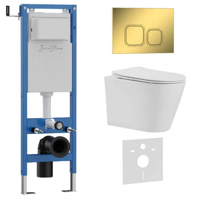 Комплект 3в1 IBERICA BLANCA инсталляция SILENCIO MINI, унитаз BURGOS ALTO белый, кнопка смыва ESTI-Q золото глянцевое (IB.001M.BRA.234.836)