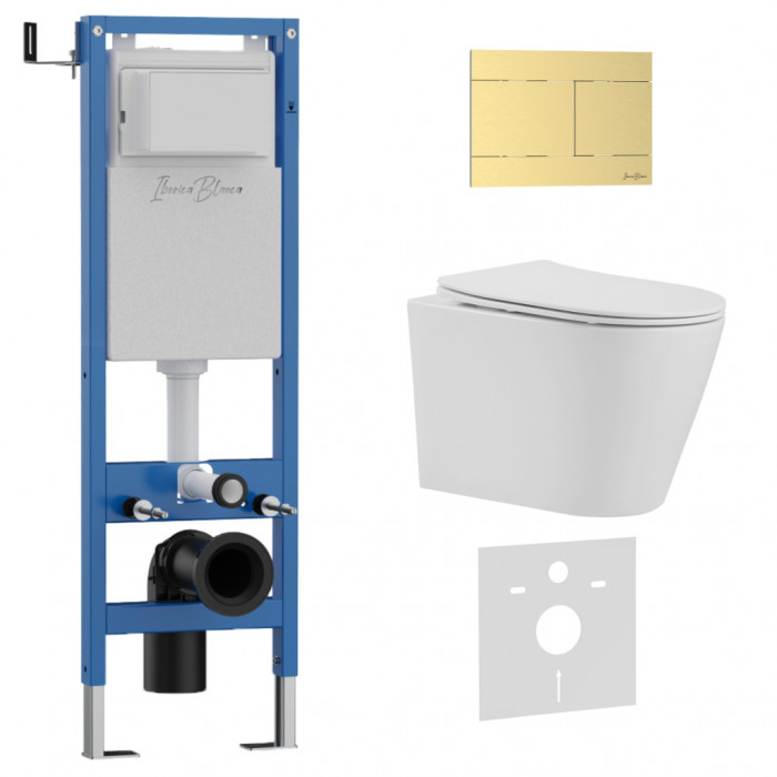Комплект 3в1 IBERICA BLANCA инсталляция SILENCIO MINI, унитаз BURGOS ALTO белый, кнопка смыва INOX-R золото матовое (IB.001M.BRA.234.1503)