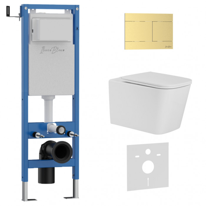 Комплект 3в1 IBERICA BLANCA инсталляция SILENCIO MINI, унитаз TOLEDO ALTO белый, кнопка смыва INOX-R золото матовое (IB.001M.TLA.234.1503)