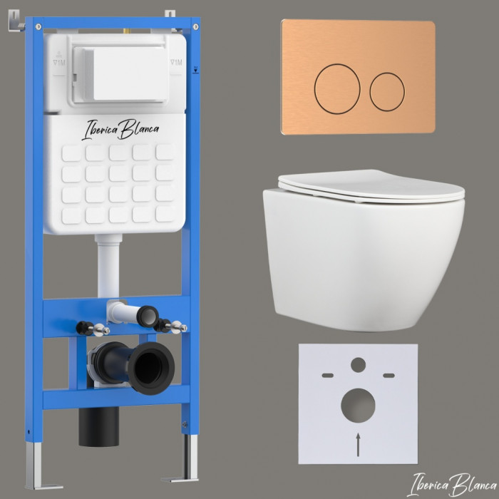 Комплект 3в1 IBERICA BLANCA инсталляция SILENCIO, унитаз BILBAO ALTO белый, кнопка смыва INOX-О розовое золото матовое (IB001.BLA.234.8172)