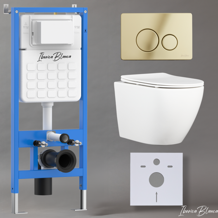 Комплект 3в1 IBERICA BLANCA инсталляция SILENCIO, унитаз BILBAO ALTO белый, кнопка смыва INOX-O золото глянцевое (IB001.BLA.234.816)