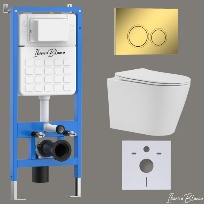 Комплект 3в1 IBERICA BLANCA инсталляция SILENCIO, унитаз BURGOS ALTO белый, кнопка смыва ESTI-O золото глянцевое (IB001.BRA.234.826)