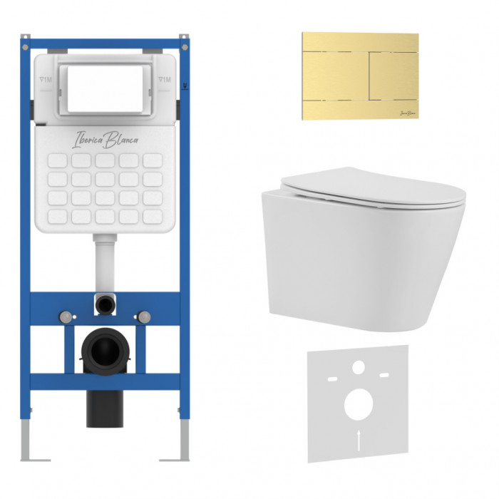 Комплект 3в1 IBERICA BLANCA инсталляция SILENCIO, унитаз BURGOS ALTO белый, кнопка смыва INOX-R золото матовое (IB001.BRA.234.1503)