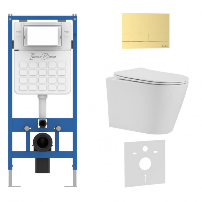 Комплект 3в1 IBERICA BLANCA инсталляция SILENCIO, унитаз BURGOS ALTO белый, кнопка смыва INOX-S золото матовое (IB001.BRA.234.1603)