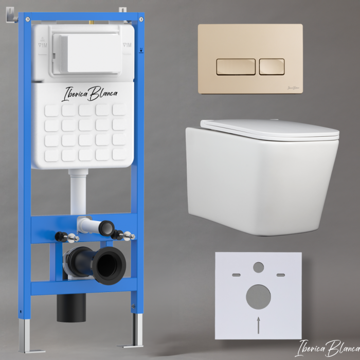 Комплект 3в1 IBERICA BLANCA инсталляция SILENCIO, унитаз TOLEDO ALTO белый, кнопка смыва ESTI-R золото матовое (IB001.TLA.234.215)