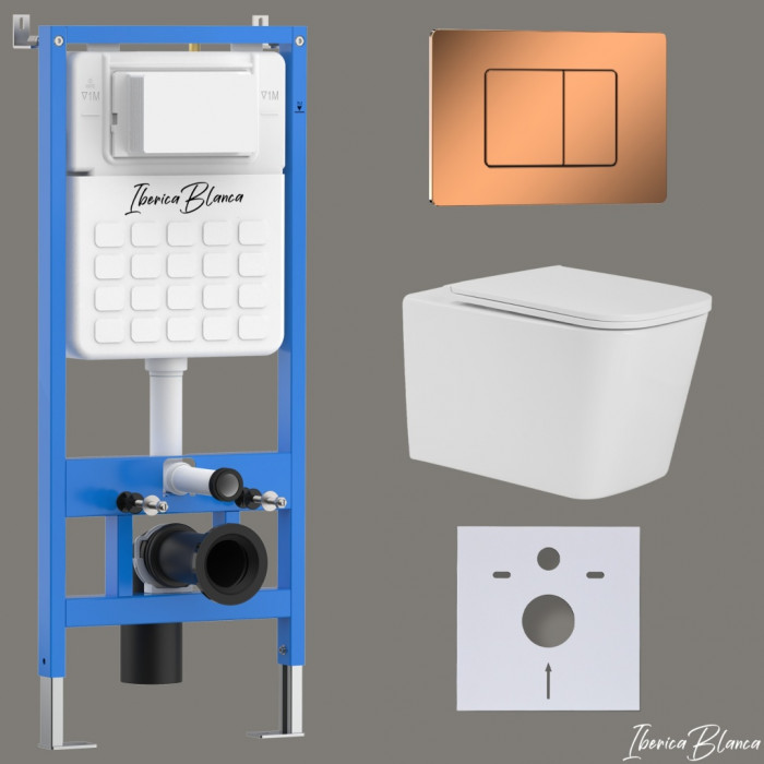 Комплект 3в1 IBERICA BLANCA инсталляция SILENCIO, унитаз TOLEDO ALTO белый, кнопка смыва INOX-C розовое золото глянцевое (IB001.TLA.234.1141)