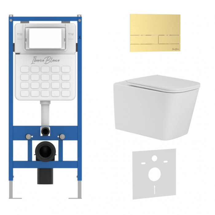 Комплект 3в1 IBERICA BLANCA инсталляция SILENCIO, унитаз TOLEDO ALTO белый, кнопка смыва INOX-S золото матовое (IB001.TLA.234.1603)