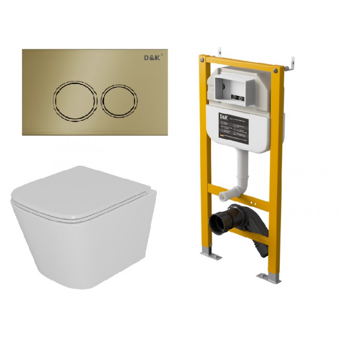 Комплект D&K Унитаз подвесной безободковый DT1436016, Инсталляция DI8050127, Клавиша смыва DB1529007 матовое золото (DS1431630)