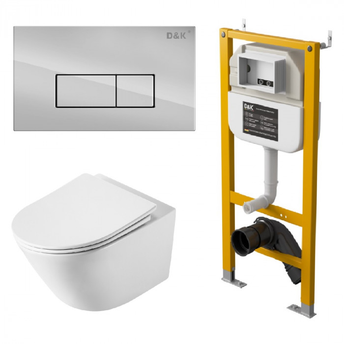 Комплект DQ унитаз DT1476516, инсталляция DI8050127, клавиша смыва DB1499001 (DS1471608) Комплект Унитаз подвесной безободковый (торнадо) DQ Rhein.Bach DT1476516, 500*360*350мм, сиденье микролифт, белый+Инсталляция рамная скрытого монтажа DQ DI8050127, 500*117*1270мм+Клавиша смыва DQ Rhein DB1499001 (арт.инсталл DI8050127), хром Германия комплект: инсталляция с унитазом и кнопкой фарфор белый Унитаз, инсталляция, крепления, кнопка смыва, паспорт. горизонтальное (в стену)