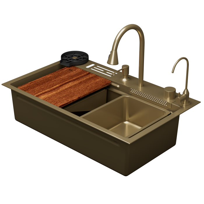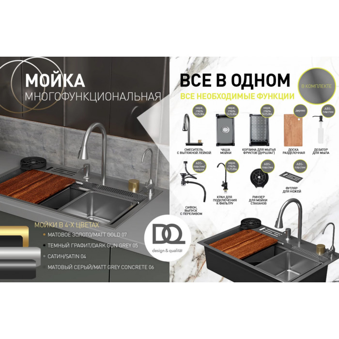 Кухонная мойка многофункциональная DQ матовое золото DKS754607 Германия встраиваемая нержавеющая сталь матовый В комплект изделия входит - чаша мойки, смеситель с вытяжной лейкой и гибкой подводкой 60см 2шт, кран для подключения к фильтру, сифон, выпуск с переливом, корзина нерж.сталь 2шт, дозатор для мыла, доска разделочная, ринзер для мойки стаканов с гибкой подводкой 60см 1шт, встраиваемый футляр для ножей, паспорт изделия 70*36
