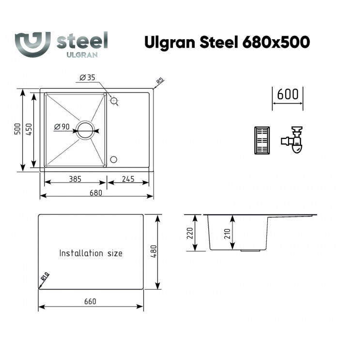 Мойка ULGRAN STEEL 680 Х 500, цвет «вороненая сталь» US 680-003