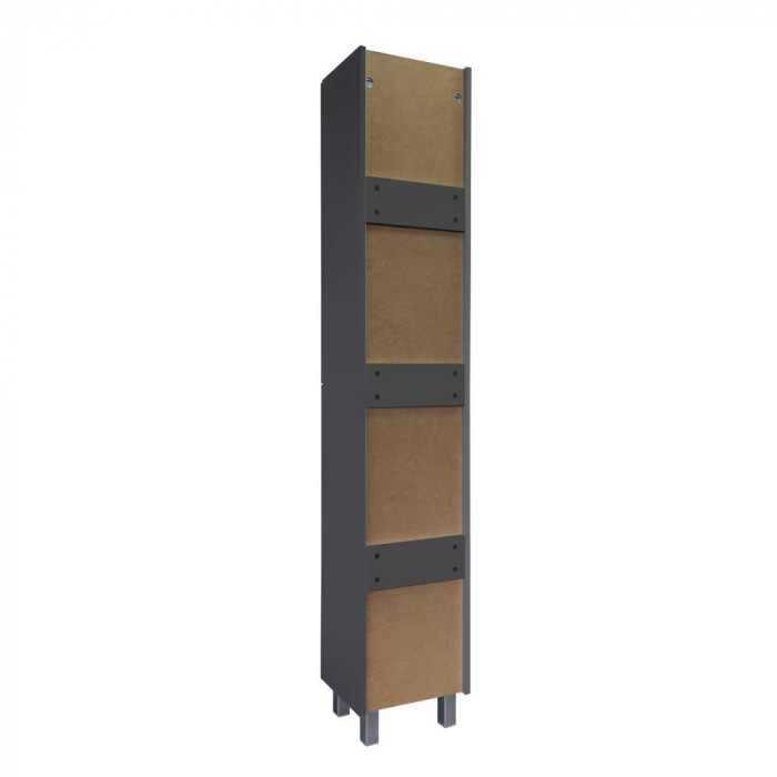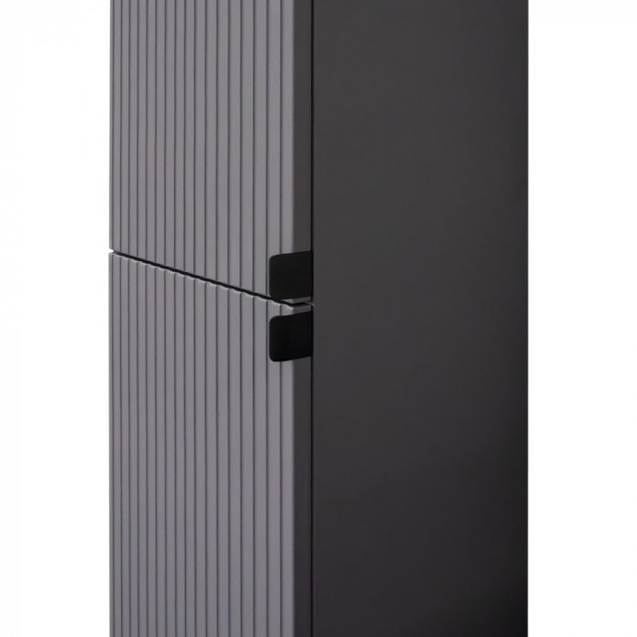 Напольная шкаф-колонна отличное решение для хранения разных предметов необходимых в ванной комнате. За верхней и нижней створками по три полки. Фасады изготовлены из МДФ декорированы вертикальной фрезеровкой и обтянуты в матовую пленку цвета антрацит с эффектом Soft Touch. Дверцы могут быть подвешены как в правом, там и в левом исполнении. Петли оборудованы механизмами плавного закрывания.