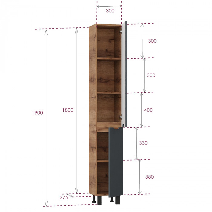 Пенал имеет два отделения за распашными дверцами с доводчиками, полки внутри регулируются по высоте. Внутреннее пространство пенала поделено полками на 5 секций, что позволяет удобно размещать косметические средства, гигиенические принадлежности и мелкие аксессуары. Ручки, изящно интегрированные в фасады, позволяют сделать эксплуатацию мебели более удобной и практичной.