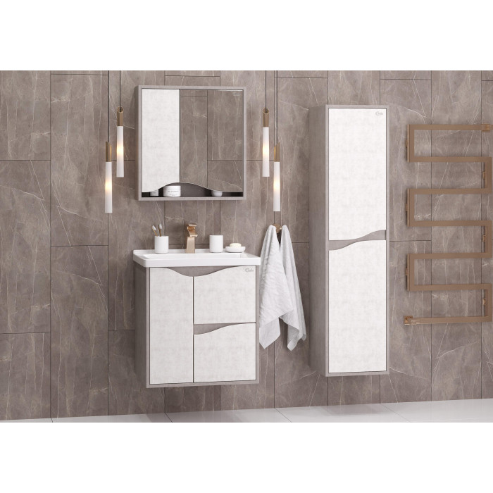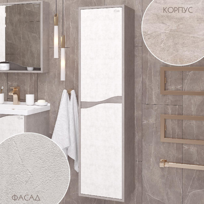 Корпус пенала выполнен из ЛДСП, фасад - из МДФ в пленке, устойчивых к механическим воздействиям, перепадам температур и высокой влажности, при этом он надежно крепится к стене и не занимает место на полу, не создавая при этом сложностей в уборке помещения.